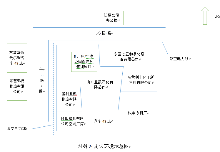 東側(cè):廠區(qū)圍墻東側(cè)自北向南依次為東營心正和凈化設(shè)備有限公司(石油裝備生產(chǎn)企業(yè))、東營利豐化工新材料有限公司與銀豐涂料廠,共用圍墻。西側(cè):廠區(qū)西側(cè)為興盛路,路對面為東營富豪沃爾沃汽車4S店與東營鴻德物流有限公司。南側(cè):廠區(qū)圍墻南側(cè)為墾利勝凱物流有限公司、勝奧建機(jī)有限公司空閑廠房、汽車4S店。北側(cè):廠區(qū)北側(cè)圍墻外為興園路,路北為一家防腐公司辦公樓。 |