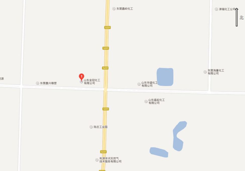 山東金冠化工有限公司位于東營(yíng)市利津縣陳莊工業(yè)園。路東為S231,S231東側(cè)為華盛化工有限公司;廠區(qū)南側(cè)為北一路;西側(cè)為鑫興橡膠有限公司;東北側(cè)120米處,布置有機(jī)械采油井;北側(cè)為空地,空地以北為黃河口酒業(yè)有限公司。 |