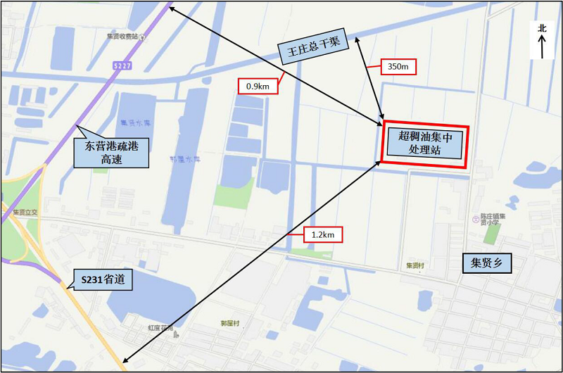 超稠油集中處理站位于東營市利津縣集賢鄉(xiāng)西北側,王莊總干渠南350m處,東南側為集賢村居民房屋,區(qū)域外圍有東營港疏港高速、S231省道等,分別距離約0.9km、1.2km。西側和北側均為農田。新建污水沉降罐距離東側消防水罐35m,距離東南側消防泵房33m,距離東南側辦公樓44m,距離南側值班室和化驗室42m,距離西南側加熱爐66m,距離西南側鍋爐操作間43m,距離西側消防器材間19.5m,距離西側聯(lián)合泵房33.5m,距離北側油罐區(qū)38m。 |