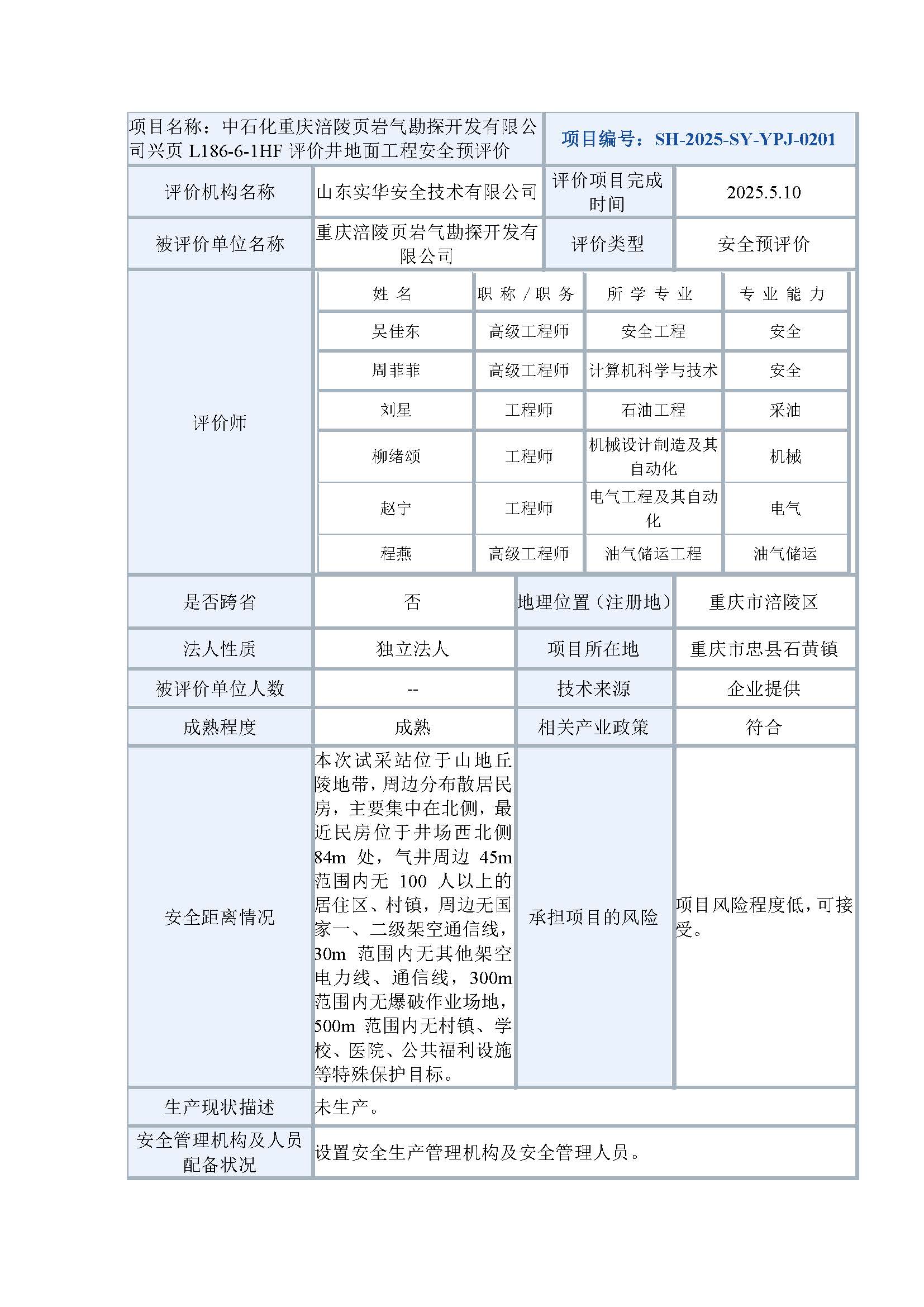 中石化重慶涪陵頁(yè)巖氣勘探開(kāi)發(fā)有限公司興頁(yè)L186-6-1HF評(píng)價(jià)井地面工程安全預(yù)評(píng)價(jià)