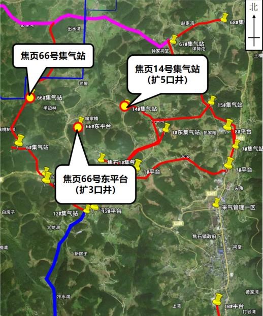 焦頁14號(hào)平臺(tái)新建井口距離東側(cè)最近的散居民房約258m,與東側(cè)架空電力線路約115m,與南側(cè)架空電力線路約81m,與西南側(cè)公路約55m。焦頁66號(hào)東平臺(tái)新建井口距離東北側(cè)最近的散居民房約99m,與西北側(cè)散居民房約114m,與北側(cè)公路約96m,與南側(cè)架空電力線路約80m。 |