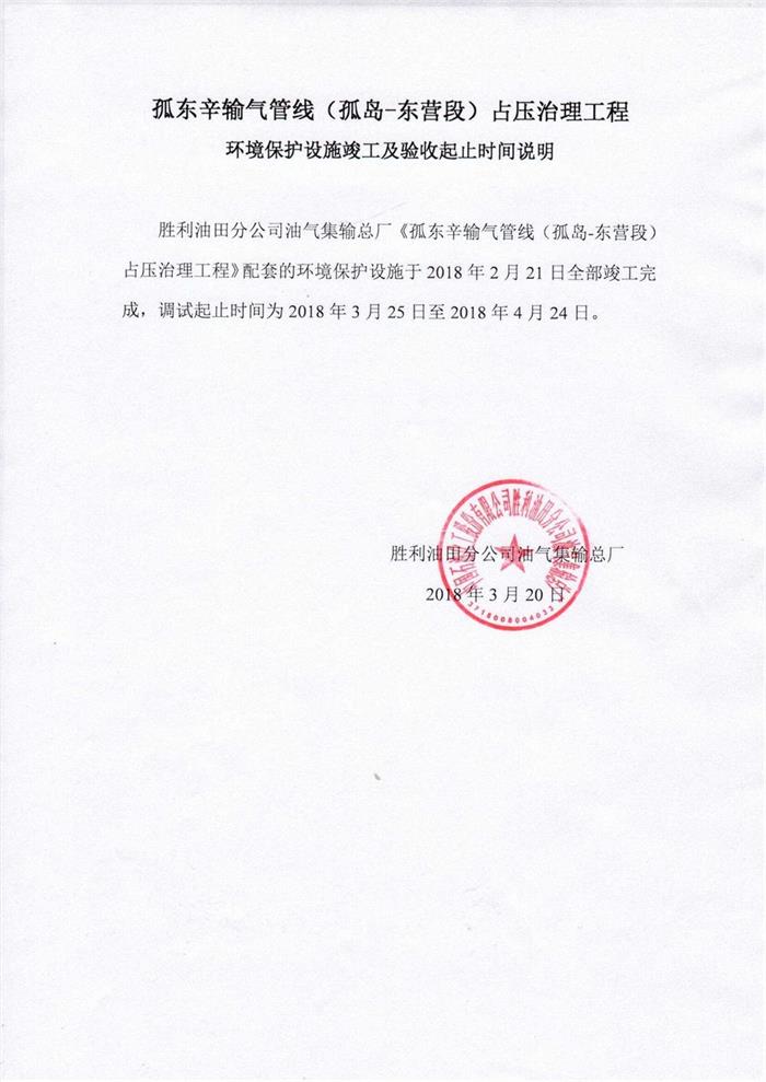 孤東辛輸氣管線(孤島-東營段)占?jí)褐卫砉こ汰h(huán)境保護(hù)設(shè)施竣工及驗(yàn)收起止時(shí)間說明