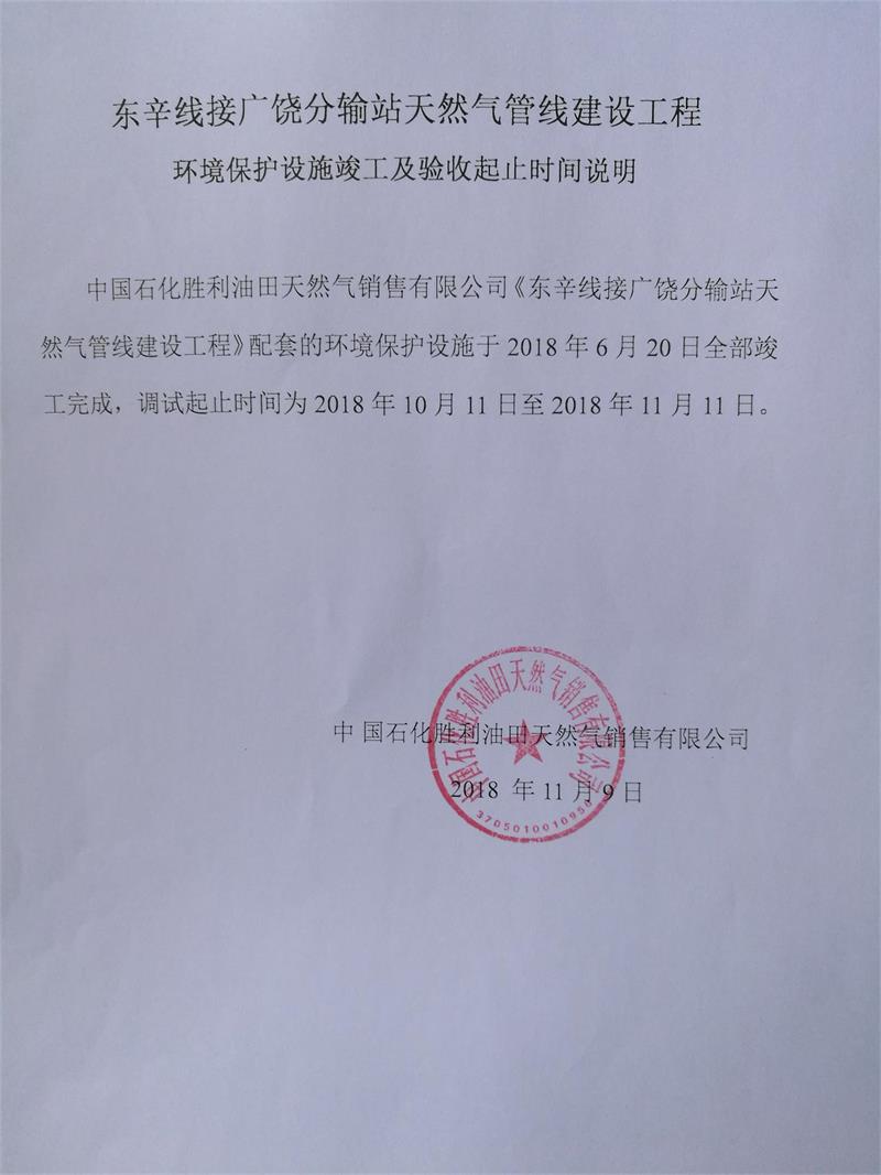 東辛線接廣饒分輸站天然氣管線建設工程環(huán)境保護設施竣工及驗收起止時間說明
