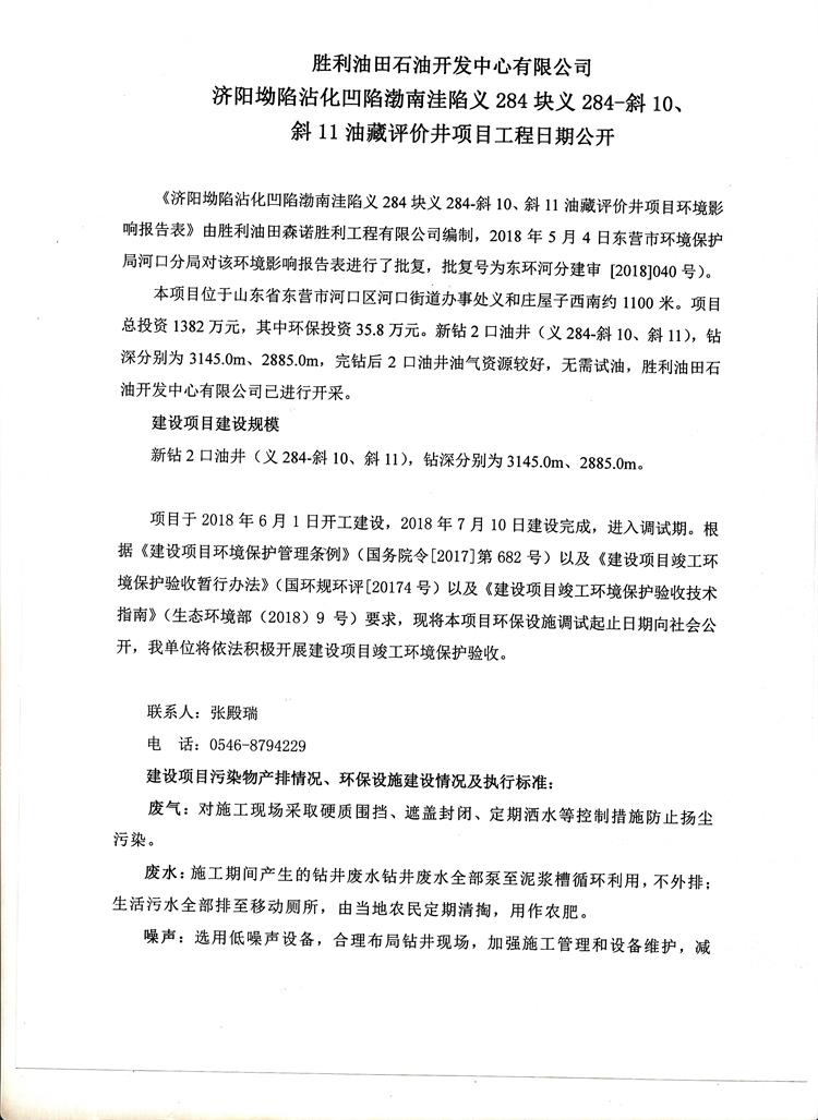 勝利油田石油開(kāi)發(fā)中心有限公司濟(jì)陽(yáng)坳陷沾化凹陷渤南洼陷義284塊義284-斜10、斜11油藏評(píng)價(jià)井項(xiàng)目工程日期公開(kāi)