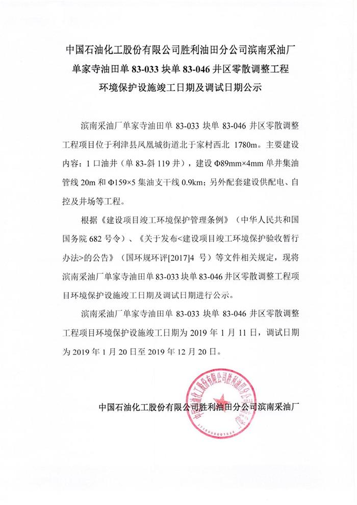 中國石油化工股份有限公司勝利油田分公司濱南采油廠單家寺油田單83-033塊83-046井區(qū)零散調(diào)整工程環(huán)境保護(hù)設(shè)施竣工日期及調(diào)試日期公示