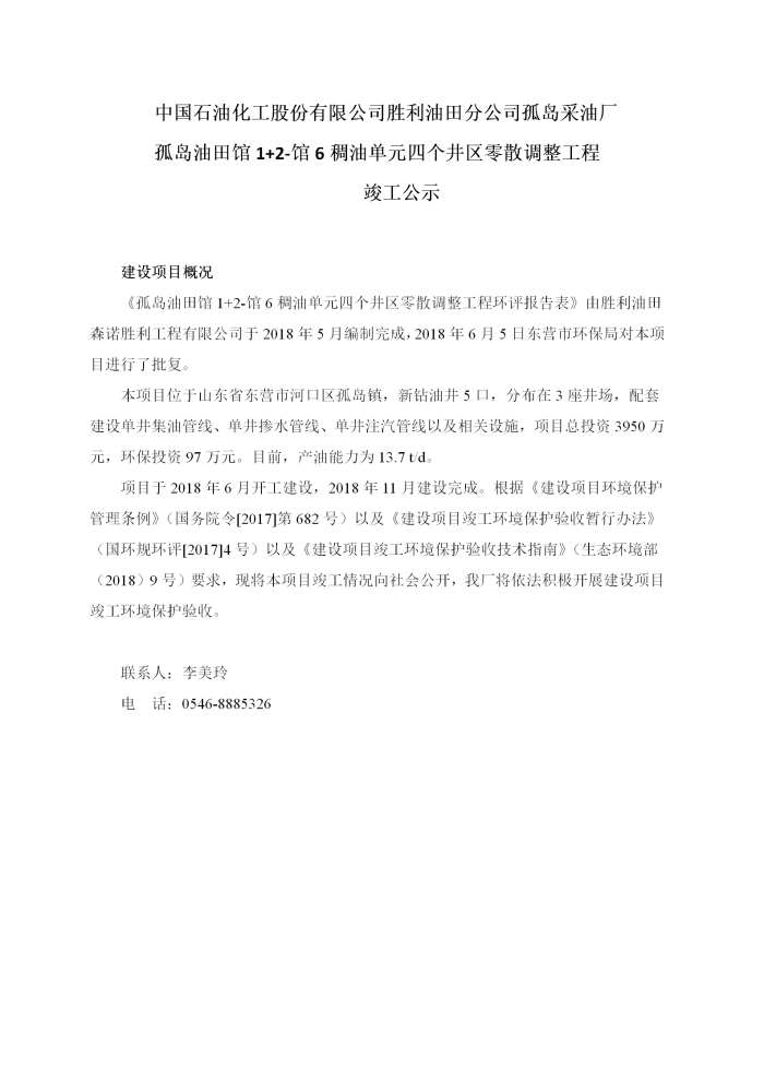 中國石油化工股份有限公司勝利油田分公司孤島采油廠孤島油田館1+2-館6稠油單元四個井區(qū)零散調(diào)整工程竣工公示