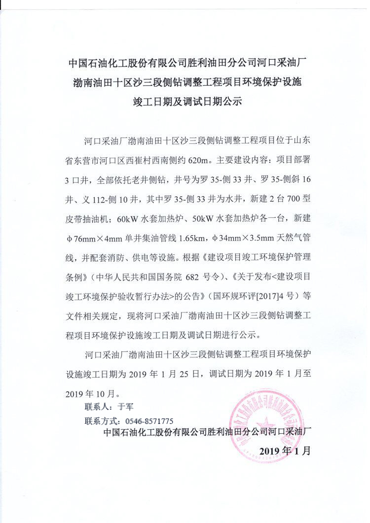 中國石油化工股份有限公司勝利油田分公司河口采油廠渤南油田十區(qū)沙三段側鉆調整工程項目環(huán)境保護設施竣工日期及調試日期公示