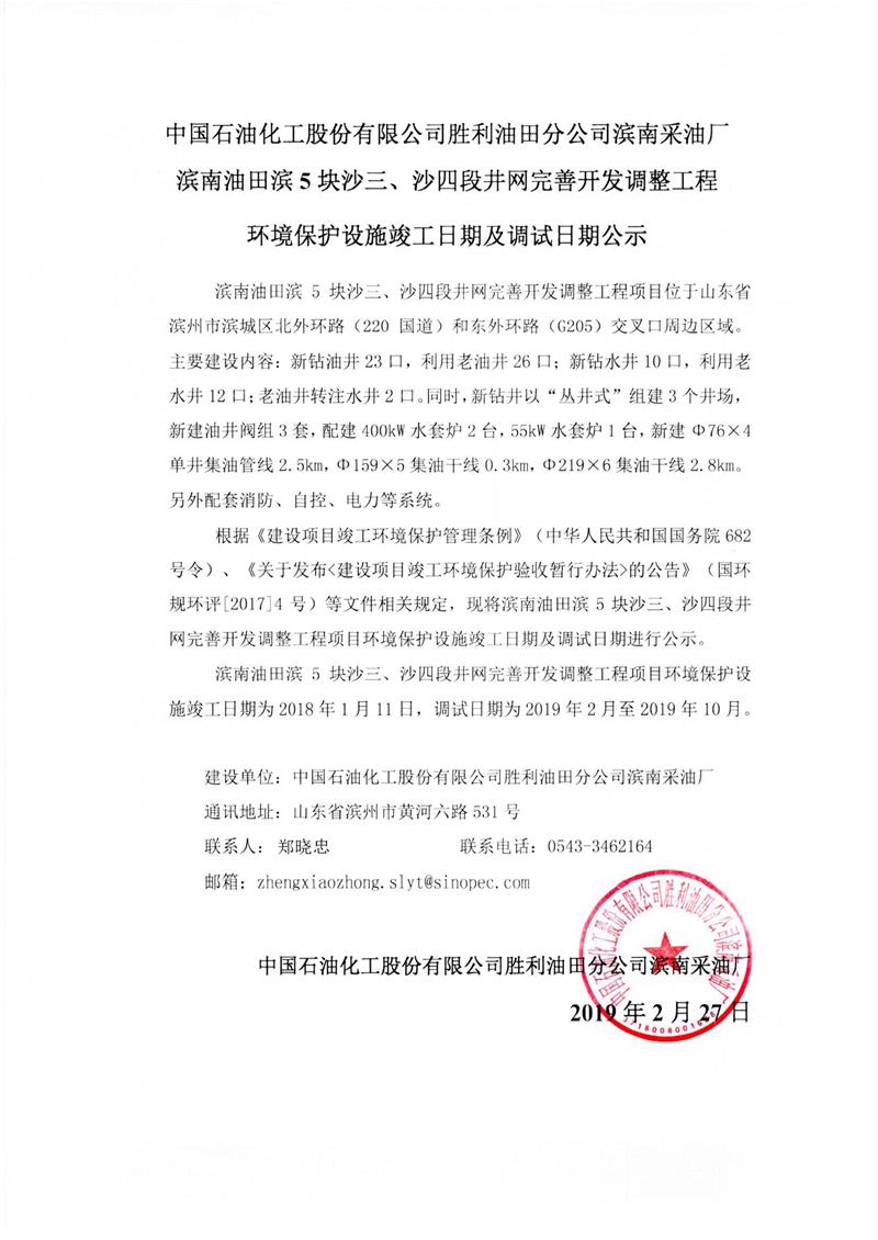 中國(guó)石油化工股份有限公司勝利油田分公司濱南采油廠濱5塊沙三、四段井網(wǎng)完善開(kāi)發(fā)調(diào)整工程環(huán)境保護(hù)設(shè)施竣工日期及調(diào)試日期公示