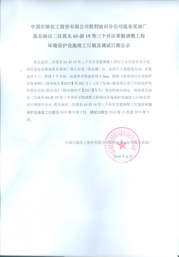 中國石油化工股份有限公司勝利油田分公司孤東采油廠孤東油田二區(qū)孤東65-斜19等三個井區(qū)零散調(diào)整工程環(huán)境保護設(shè)施竣工日期及調(diào)試日期公示